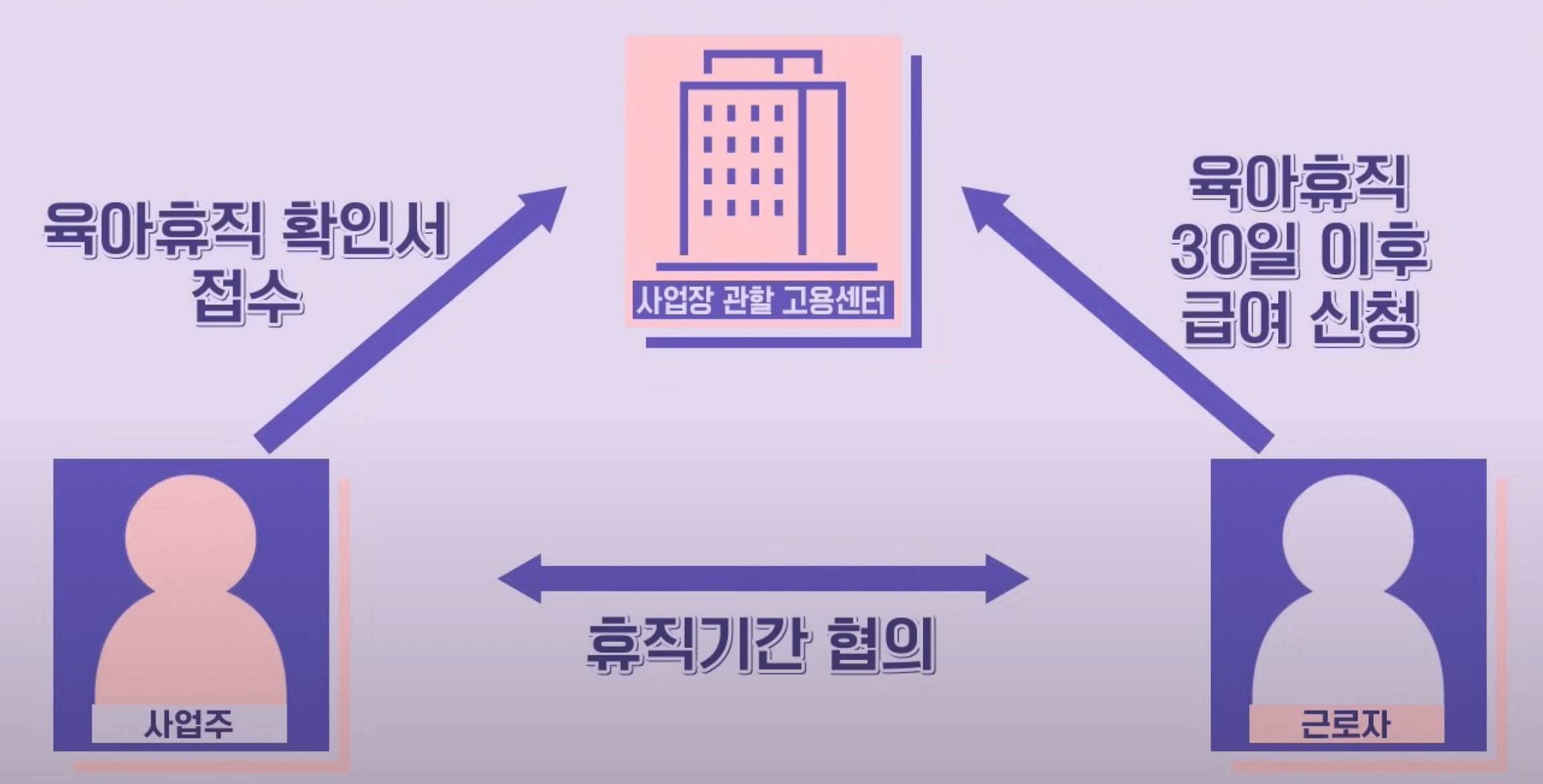 아래의 순서대로 육아휴직 신청이 진행됩니다. 근로자가 사업주에게 육아휴직을 요청하고, 사업주가 근로자에게 육아휴직 확인서를 발급해줍니다. 그리고 1달 이후 급여신청서 등의 서류와 함께 관할 고용센터에 급여신청서를 제출하면 됩니다.